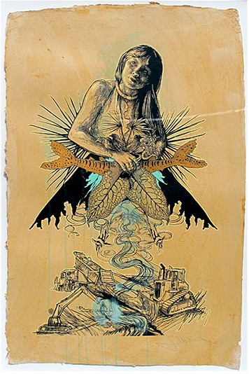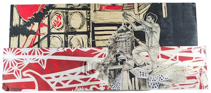 BEN #36ButtonType: Hand Painted Screen Print on Newsprint Paper Wheat pasted to an Assemblage of Wood Panels Reincarnated from Swoon's "Swimming Cities Of Switchback Sea" Installation Edition: Unique Dimensions: 26" X 60" X 2" Release Date: 2012